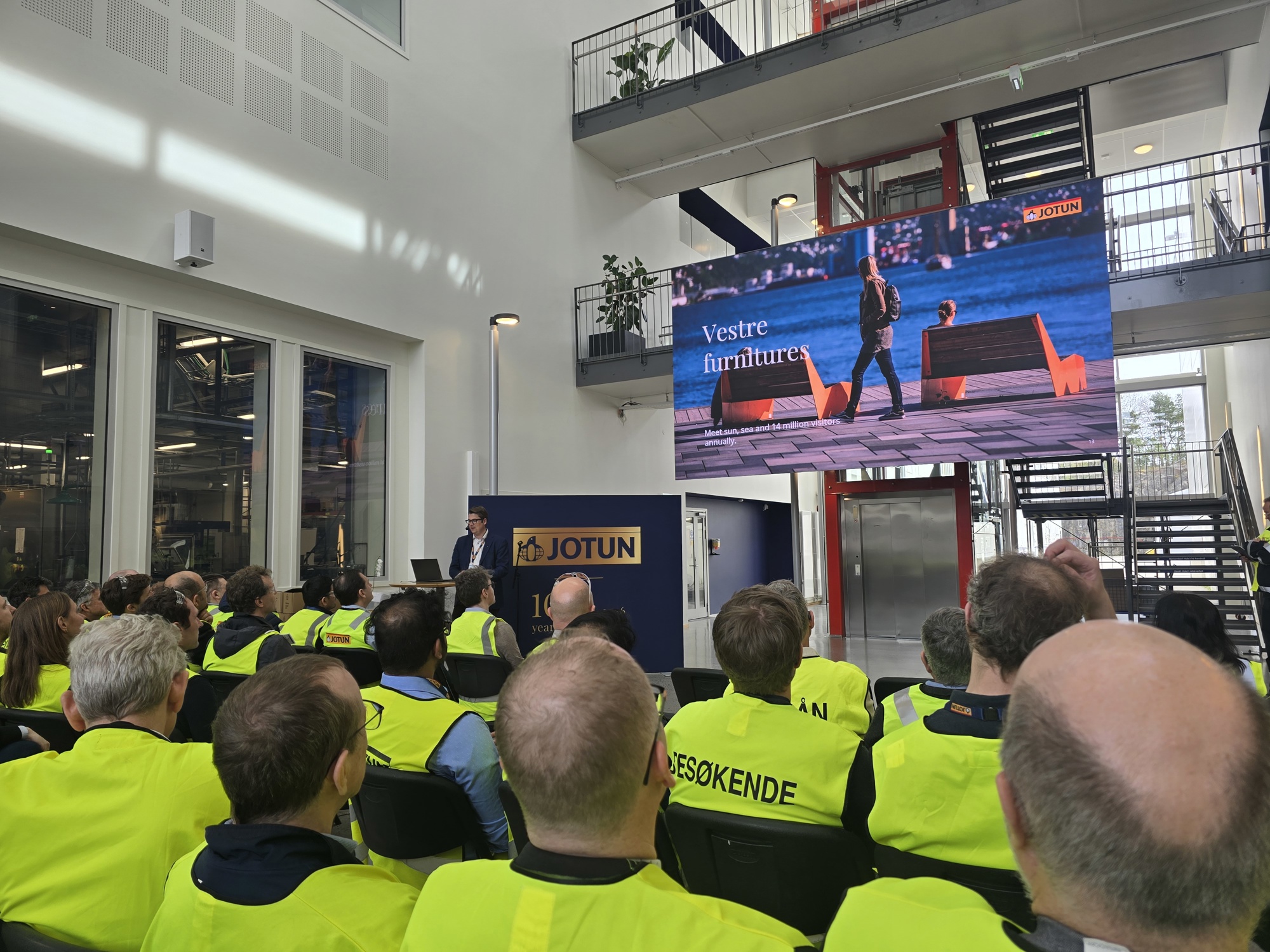 Konferansens første dag var deltakerne på en omvisning på Jotuns anlegg – en moderne, automatisert fabrikk som viser hvordan teknologi og tradisjon kan gå hånd i hånd.