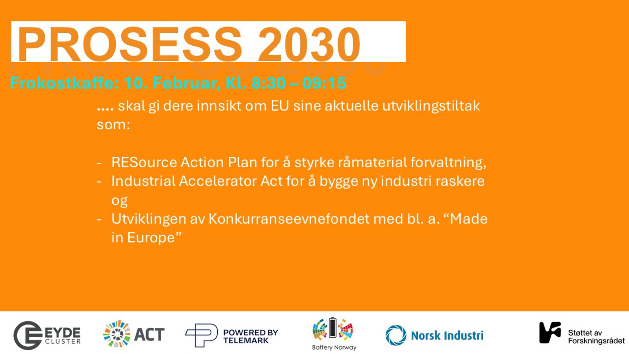 Prosess 2030er et nettverk for mobilisering av Norsk Industri til innovasjon, forskning og utvikling gjennom det europeiske forskningsprogrammet, Horizon Europe. Prosess 2030 er Norsk Industri, industriklyngene Eyde, Power by Telemark, Arctic cluster Team og Battery Norway. I tillegg er SINTEF, NTNU, IFE og Prosess 21 med i partnerskapet.